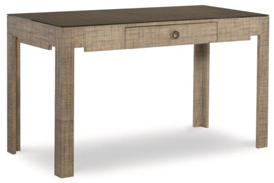 This desk is using the fibers of the Tipot palm tree this raffia features a rich dimensional depth not found in lesser machine woven grasscloth. Comes standard with a lay on glass top.