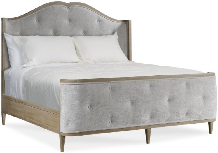 This graceful bed's wood-framed and upholstered and button tufted headboard and footboard each curve gently inward, forming a cozy rest. The delicate wood border invites the eye to trace the headboard's open book profile. The bed rests on lovely tapered feet.Read More