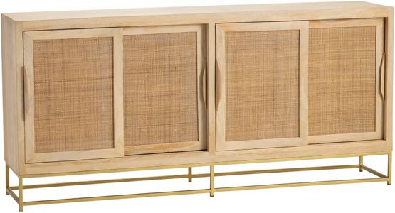 The Crestview Collection Bengal Manor Natural Cane Sideboard the light brown finish with a gold metal base has 4-doors with woven cane detail. The doors slide from side to side allowing access to the concealed storage inside, keeping other storage concealed as what you need is taken out.Read More