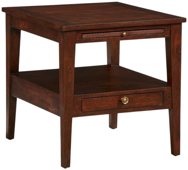 Simple and nicely scaled in oak and oak veneers with a warm umber finish. The reversed, straight grain oak veneered top has a mitered-corner border and tapered legs housing a pull-out tray in the top apron and a narrow drawer in the aproned mid-shelf.Read More