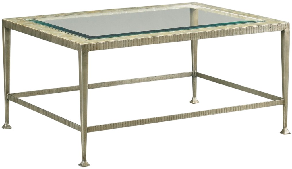 This hand-forged iron cocktail table features a handsome ribbed detail on the top perimeter and the stretcher. The finish is a champagne gold the blends beautifully with the Capiz shell top border with inset clear beveled glass.Read More