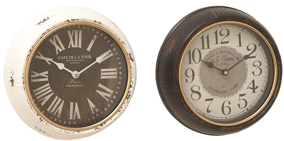 Infuse your home with romantic nostalgia and timeless grace, where ornate and antique details showcase your personality and create a sanctuary of charm and warmth in the home. The wall clocks are constructed of solid iron for a durable structure. Features distressed white and black wall clocks with black and white faces.Read More