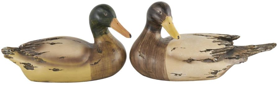 Rustic set of 2 accent statues is molded with polystone and shaped into a duck figure with painted detailing