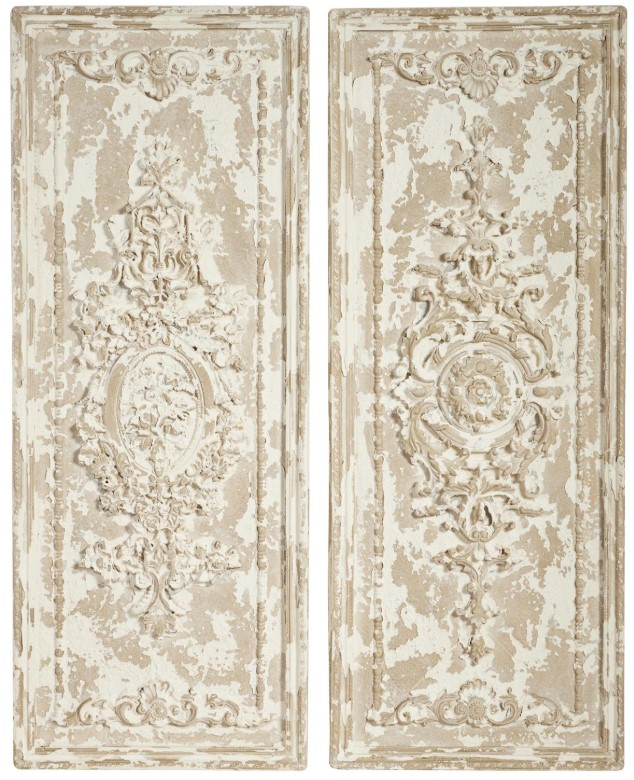 Square decor set for wall exhibits a textured and distressed beige wooden finish, adding an antique charm to any setting. Fiberclay set of 2 wall decors features rectangular panels adorned with embossed ornate traditional carvings and pseudo-frames, enhancing its visual appeal.