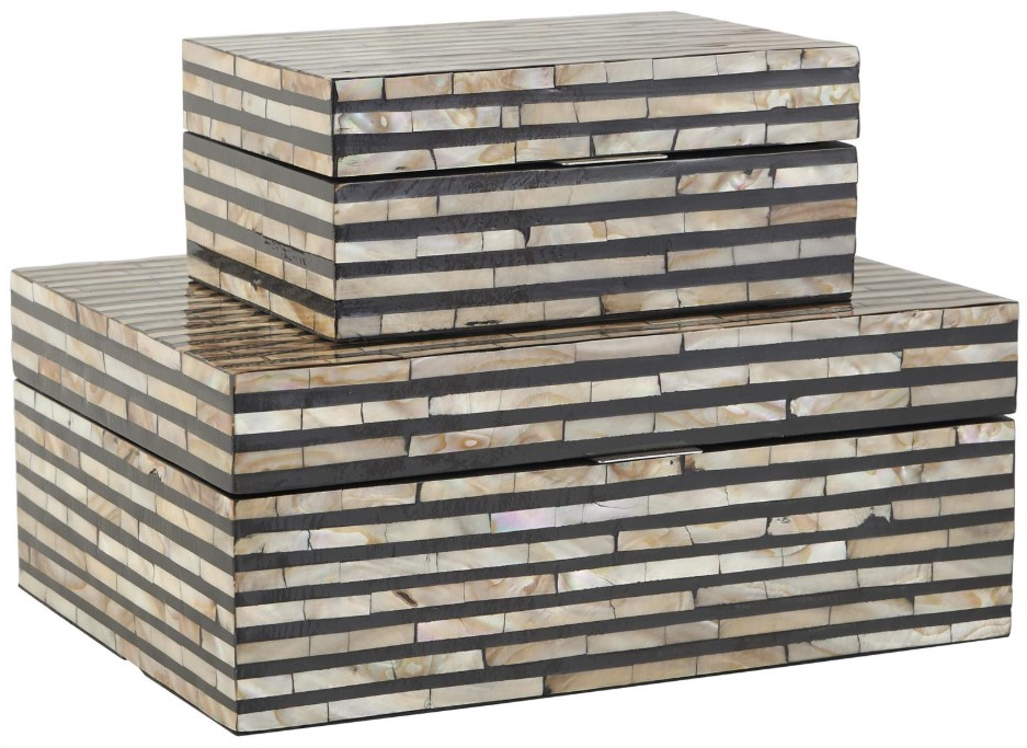 Perfect way to add depth and texture to your surface space with this compact and discreet box. A practical yet stylish upgrade that instantly elevate the look of your room. Ideal for use as a jewelry box or table centerpiece in living rooms, this beige set of 2 decorative keepsake boxes infuse any space with a laidback vibe. Designed with felt or rubber stoppers at the base that prevent scratching furniture and table tops, as well as sliding around. This item ships in 1 carton. Mother of pearl box makes a great gift for any occasion. Due to the handmade nature of this item, no two will be alike, there will be slight differences in shape, size, and color. Suitable for indoor use only. This item ships fully assembled in one piece.