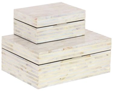 Perfect way to add depth and texture to your surface space with this compact and discreet box. A practical yet stylish upgrade that instantly elevate the look of your room. Ideal for use as a jewelry box or table centerpiece in living rooms, this white set of 2 decorative keepsake boxes infuse any space with a laidback vibe. Designed with felt or rubber stoppers at the base that prevent scratching furniture and table tops, as well as sliding around. This item ships in 1 carton. Mother of pearl box makes a great gift for any occasion. Due to the handmade nature of this item, no two will be alike, there will be slight differences in shape, size, and color. Suitable for indoor use only. This item ships fully assembled in one piece.