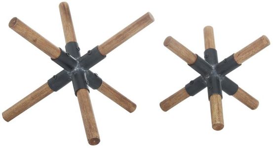 Oiled brown home decor figurines highlight a jack shaped design with six thin wooden accents, making them visually captivating