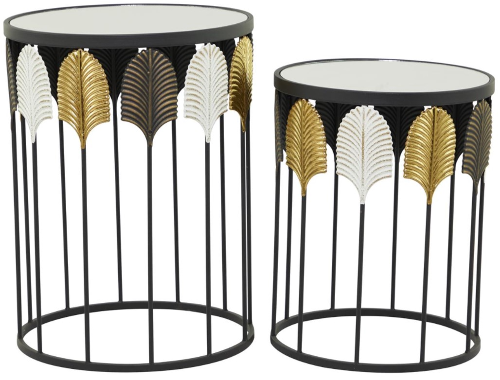 Embrace artistic expression with a style that highlights bold designs with sleek lines, neutral elements, and a minimalist aesthetic. Round pedestal side tables are sturdy constructions of iron and mirror. Black round end table set carries metallic gold, silver, and white leaf accents.Read More