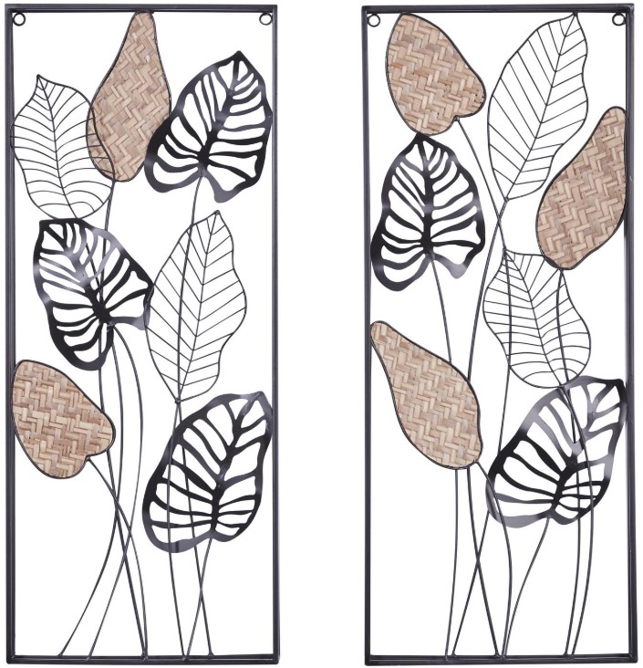 Rectangle decor set for wall exhibits a unique combination of a black frame and a brown finish that adds a touch of sophistication to any space. This iron set of 2 wall decors boasts modern style with 3D features, including 14 pointed leaves with pierced metal veins positioned in a staggered upright manner.