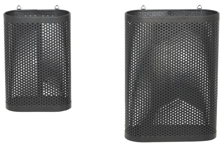 These solid black metal wall magazine racks carry oval rims and perforated panels