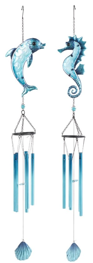 The dolphin and seahorse shapes of the animal windchime 2-piece set along with the seashell shape of the dangling charms