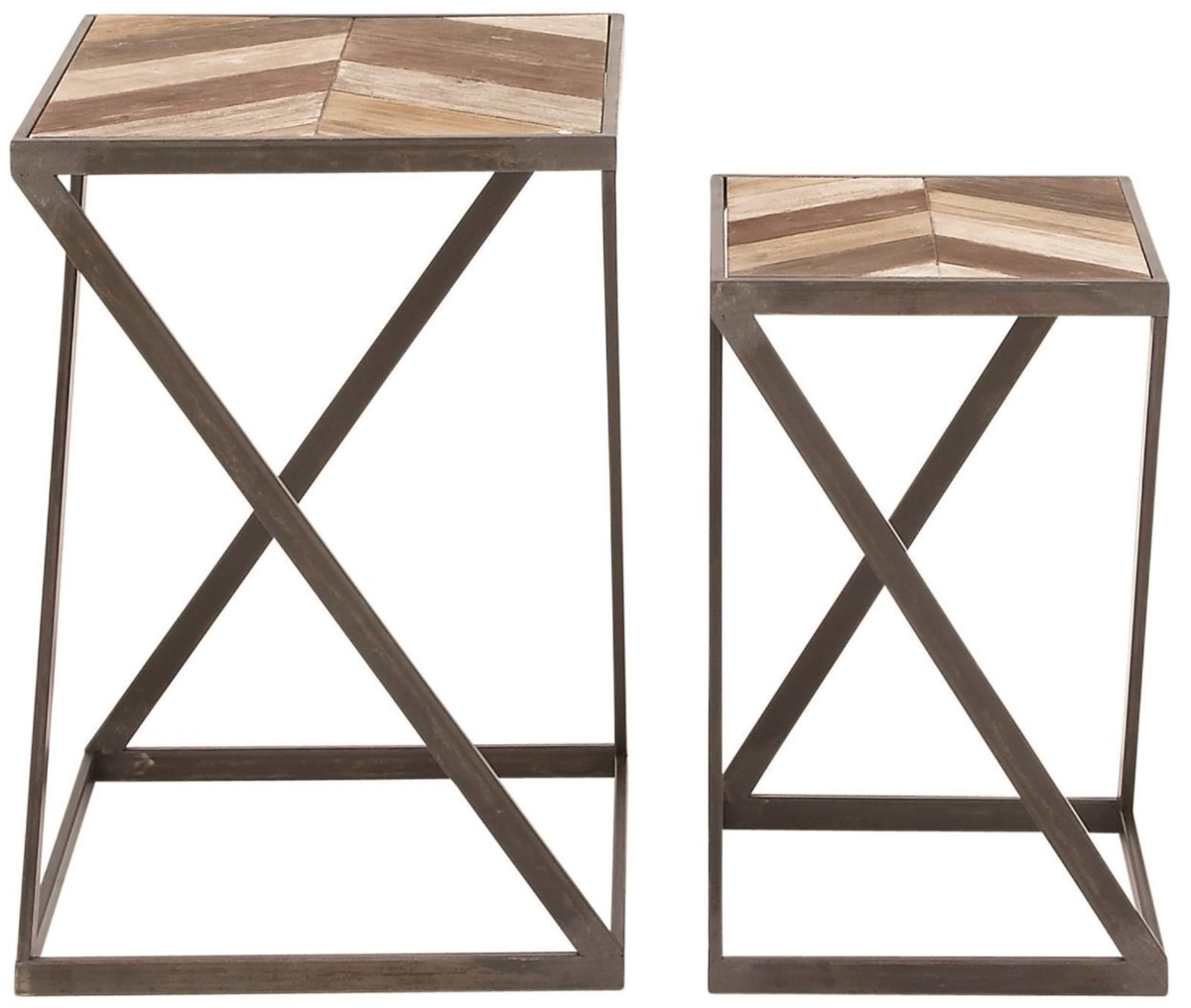 The metal frame of each accent table is welded and soldered together and secures a wooden patterned tabletop