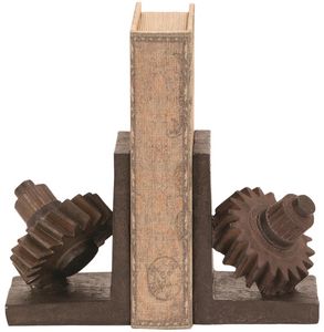 Features a detailed gear designs mounted on a pair of L-shaped platforms, enhancing the charm of this weathered brown book organizer