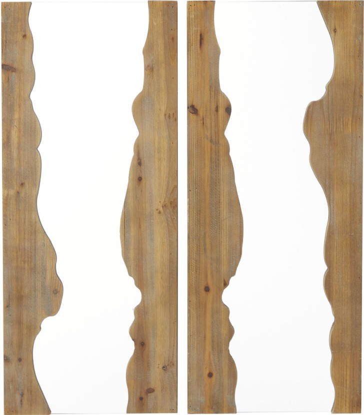 This rectangle hanging wall mirrors assortment offers elegant live edge frames with a washed brown wooden finish. The fir assortment of 2 wall mirrors showcases two light and golden-brown wood sections with natural grain and one-of-a-kind live edge silhouettes.