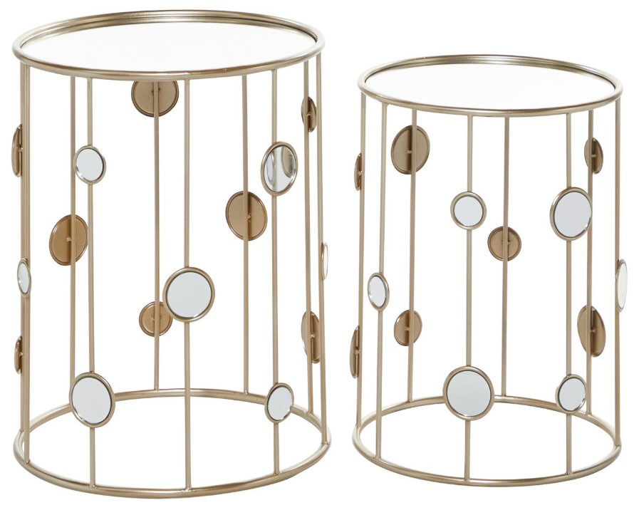 The features of this iron set of 2 accent tables include a compact design with an open frame, along with a mirrored top that has raised edges to ensure safe display.