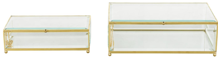 Rectangle jewelry cases set is adorned with a shiny clear glass finish, complemented by a gold metal frame and strips of blue, lending an air of elegance to any decor. This glass set of 2 jewelry boxes features a gold metal frame that adds an extra layer of sophistication, making them perfect for storing your precious items.