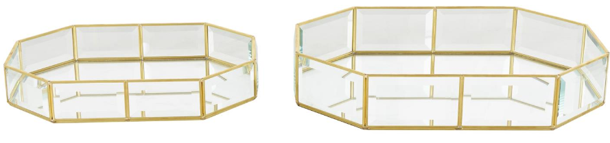 Octagon jewelry cases set boasts a shiny clear glass finish, accentuated by a gold metal frame and strips of blue, lending an elegant touch to any decor. This glass set of 2 jewelry boxes features a gold metal frame that adds an extra layer of sophistication, making them perfect for storing your precious items.