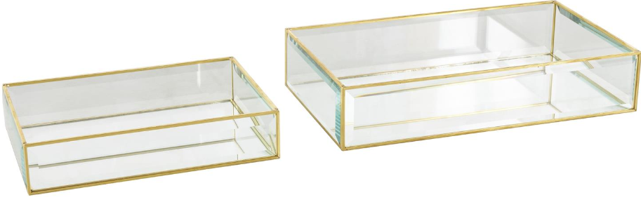 Rectangle jewelry cases set is adorned with a shiny clear glass finish, complemented by a gold metal frame and strips of blue, lending an air of elegance to any decor.. This glass set of 2 jewelry boxes features a gold metal frame that adds an extra layer of sophistication, making them perfect for storing your precious items.