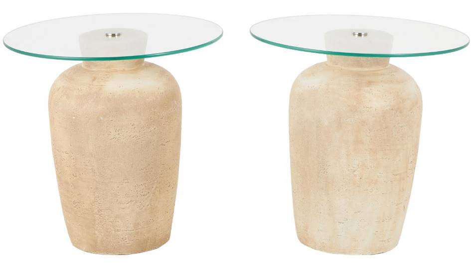 Embrace artistic expression with a style that highlights bold designs with sleek lines, neutral elements, and a minimalist aesthetic. This beige side end accent table set is made from magnesium oxide and features a glass tabletop. Round table set boasts a sophisticated sandstone beige finish with a clear glass tabletop, making it an eye-catching piece.Read More