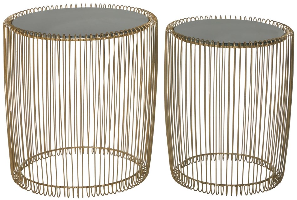 Round table set boasts a stunning satin gold frame, complemented by a contrasting black glass top. This iron set of 2 accent tables is notable for its unique design, featuring vertical metal rods connecting to the bottom ring in an open-style structure, topped with a black glass surface.
