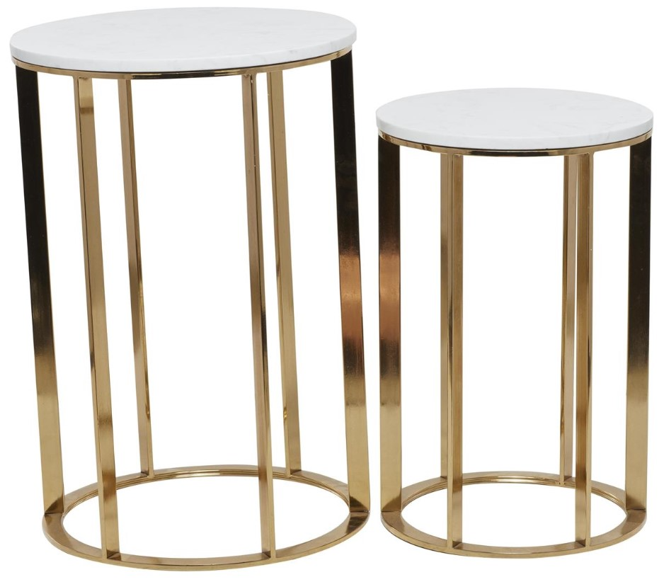 Round table set features a striking contrast of white marble tops and glossy metallic gold leg base finish, exuding an air of contemporary elegance. Iron set of 2 accent tables boast polished marble tops that are beautifully complemented by their glossy bases, creating a mod and sleek style.