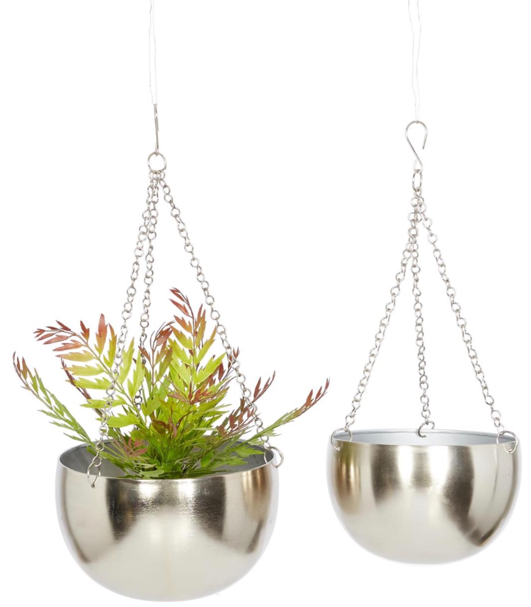 Ideal for gardens, offices or living rooms, this silver set of 2 hanging planters can add a bright touch to complement your contemporary space.