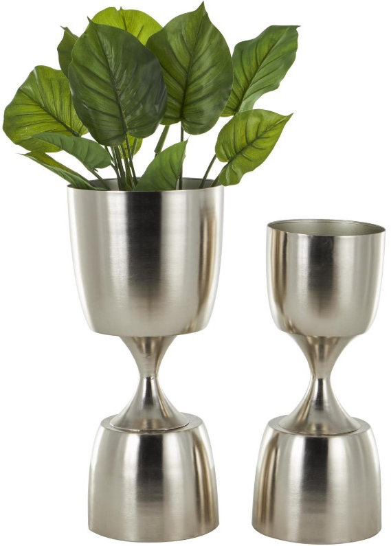 The hourglass shape of the shiny silver flower pots for outdoor plants provides a unique aesthetic appeal while maximizing space for your plants