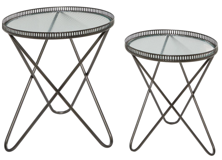 Features an industrial inspired design to make your space unique This metal and glass side table set is made from solid iron and high strength glass materials. Feature dark silver iron construction with sturdy table tops.Read More