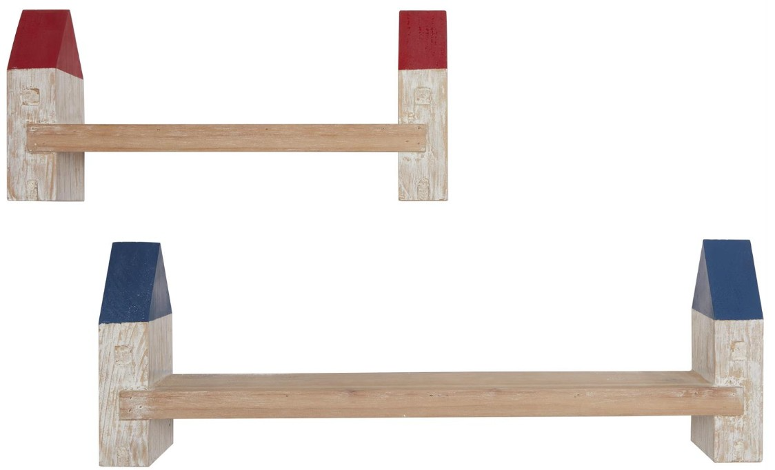 Coastal wall shelf set highlights a distressed whitewashed wood finish with painted blue and red detailing and a light brown shelf. Playful wall accent pieces feature a boat inspired style with 2 various sized shelves, allowing for a clean and organized space.