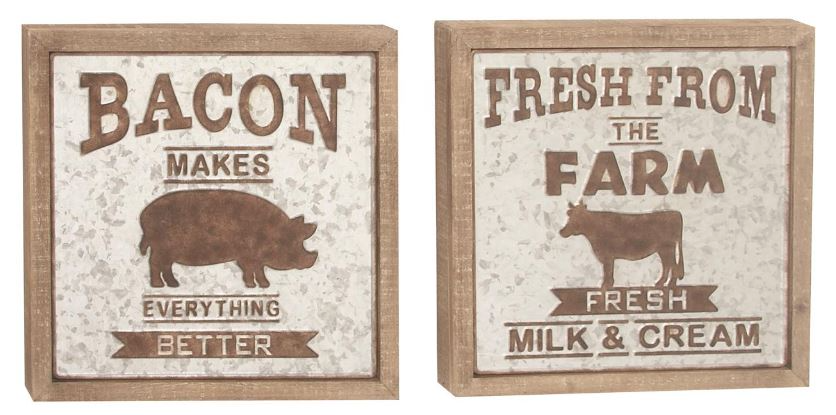 Designed with a farmhouse style for that homey feeling. Composed of Chinese fir wood and iron. Silver background with natural brown frame and lettering. Easy-to-read typography advertises farm fresh products, features silhouettes of a pig and cow.Read More