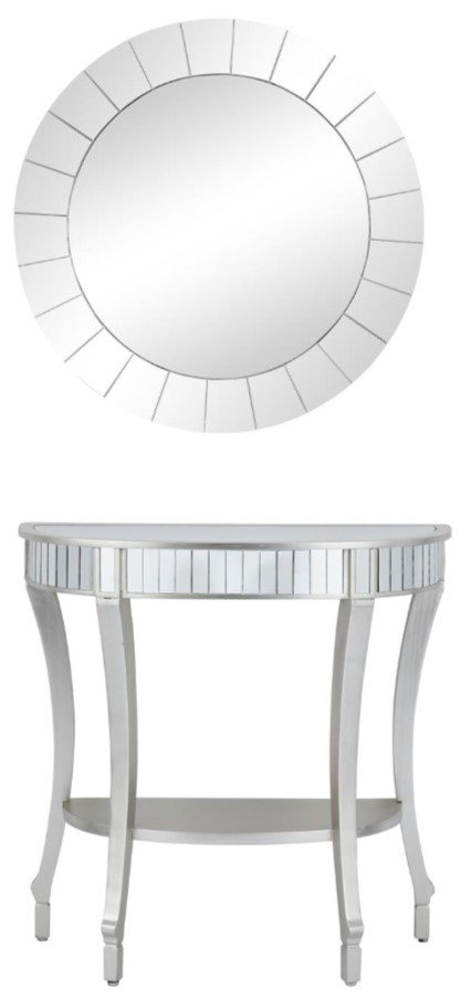 This glam console table is overlaid with mirrors and highlights an oiled silver finish. Precisely cut glass mirrors outline the top and skirt of this console table that complements its splayed tapered legs.