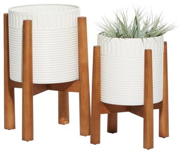 Inspired by sleek elegance and clean lines, a minimalistic design offers effortless luxury with monochromatic tones and bold, angular structures. White indoor outdoor planter set is constructed from durable metal with a removable wooden stand for added functionality and style.Read More