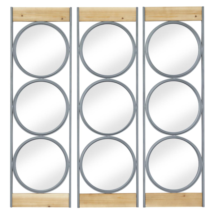 Each wall mirror accentuates a long rectangular outer frame with inner round frames