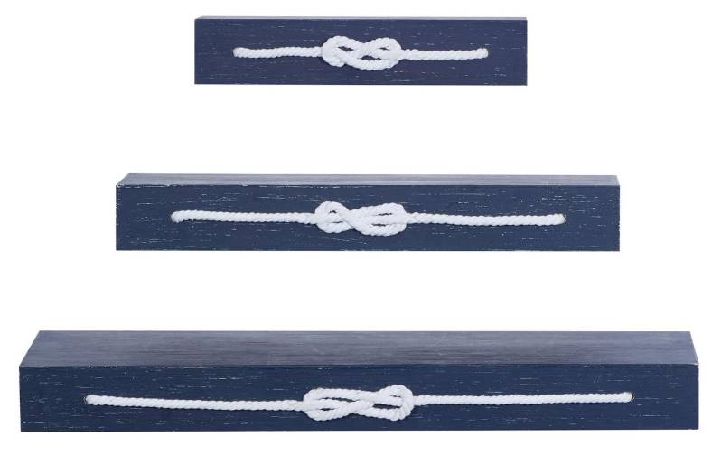 Distressed blue room floating shelves feature various-sized rectangular shapes with a solid white knotted rope design for added visual interest