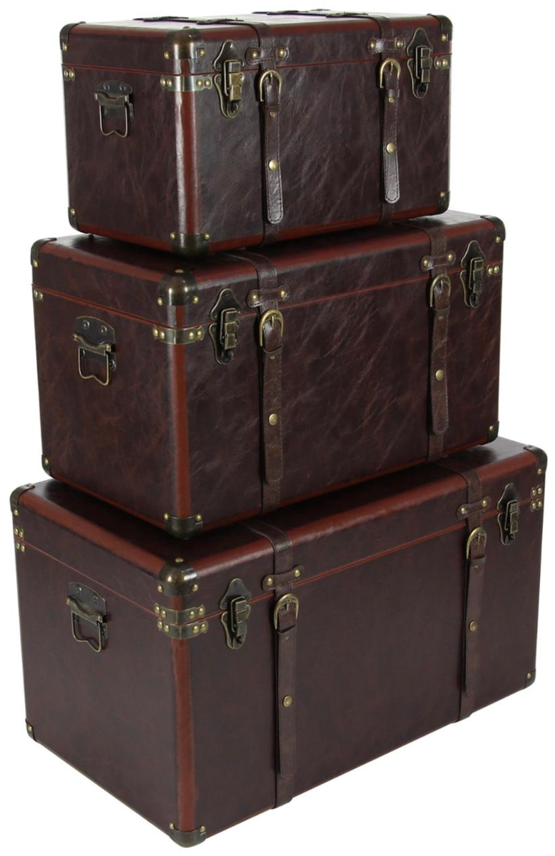 This brown colored faux leather storage trunk comes as a set of 3. Traditional style.