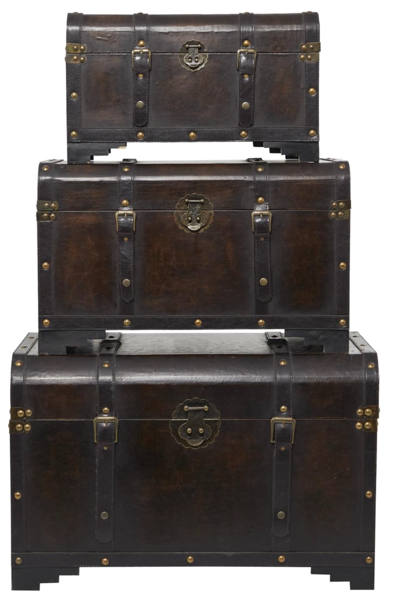 In this traditional set of 3 decorative storage boxes with lids, each wooden material is encased in faux leather while metal accents are securely glued on each trunk for added durability and style