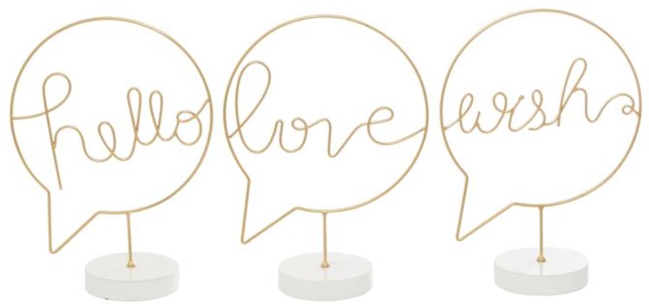 This gold colored mdf standing sign comes as a set of 3.