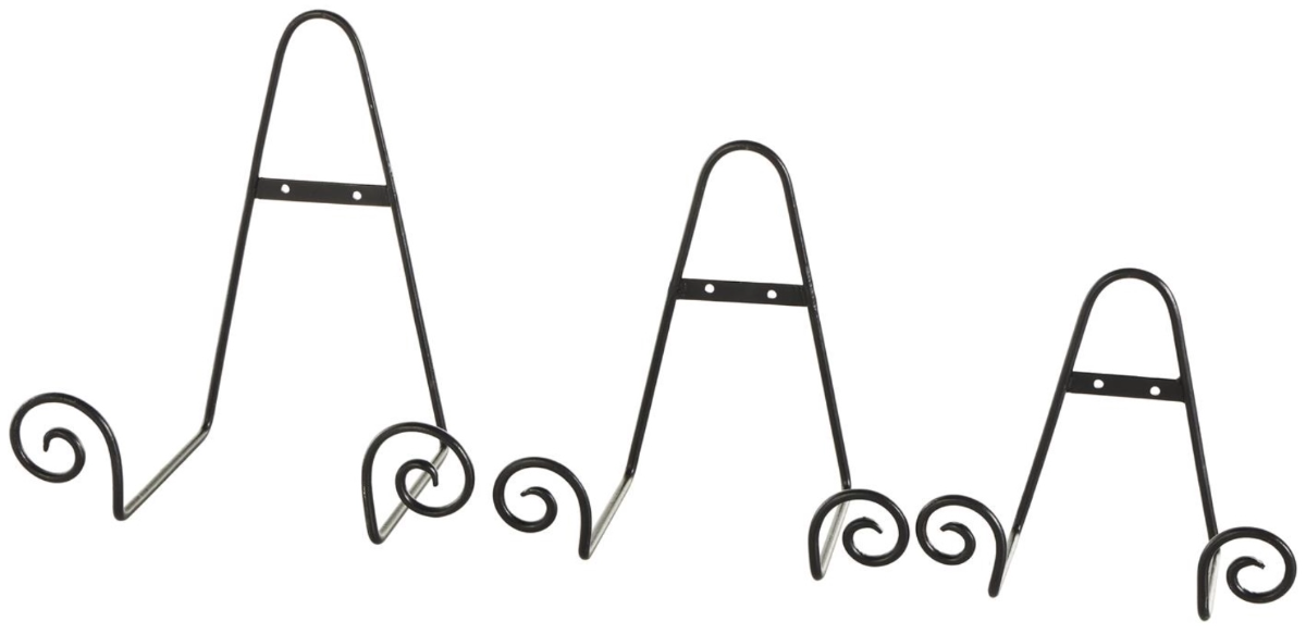 The triangular shape of this matte black decorative easel has intricated scrolled ends that add a contemporary and geometric flair that stand out