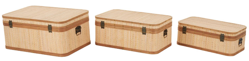 Rectangular home storage trunks set features a textured light brown finish with brass metal latches and brown wooden accents. This rattan set of 3 storage trunks includes brass metal latches and sturdy wooden accents for added durability and security.