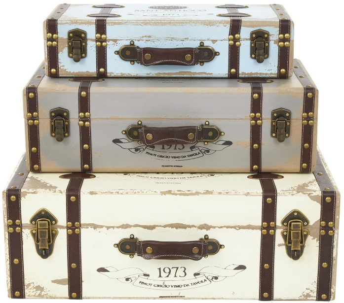 These distressed multi-colored decorative storage boxes boast a rectangular shape complete with conventional luggage handles for easy handling