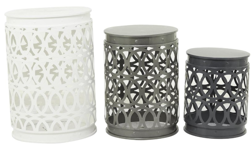 A contemporary style offers neutral elements and basic forms with a bold design. Round pedestal side tables carry a sturdy construction of solid iron. Round side table set includes blue, red, and white columnar style accent pieces. Set of 3 pedestal side tables features cross patterns with rounded edges.