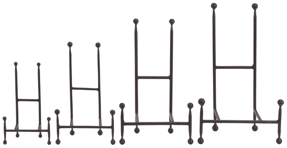 Put your show art and signs on display with this charming easel. Durable and sturdy, this easel lets you display your favorite things with ease, and with out overshadowing your piece. The black set of 4 tabletop easel adds height to your desk, shelf, or mantel while elegantly displaying artworks or photos. This item ships in 1 carton. Put your show art, books, memorable moments and signs on display with this delicate easel. Suitable for indoor use only. This item ships fully assembled in one piece.