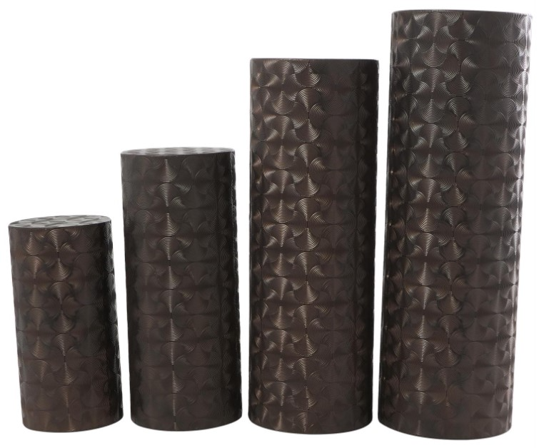 These tall cylinder shaped metal pedestal tables come with a flat table top and a hollow interior