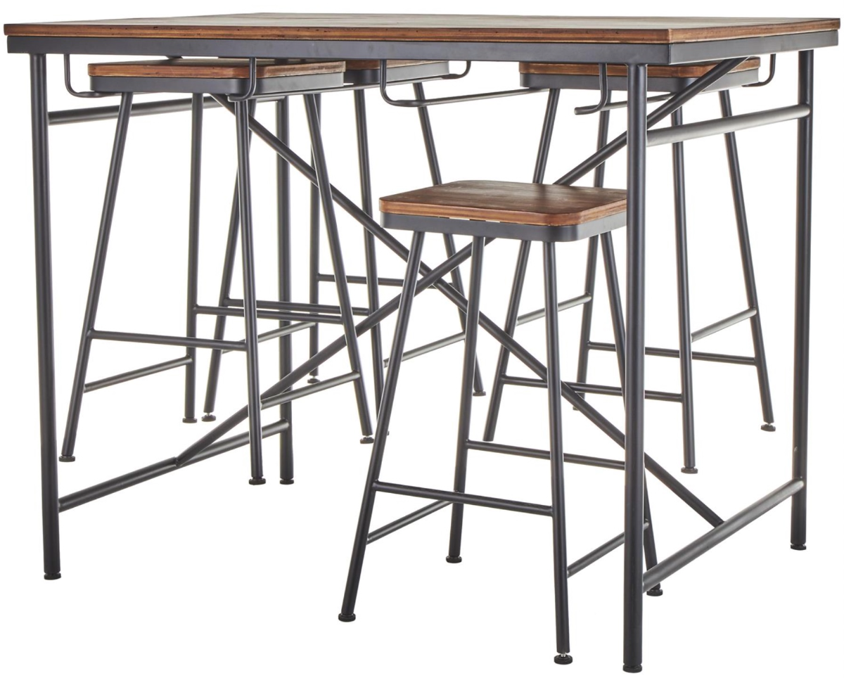 Rectangular compact dining table and stool set features four square stools with footrests and flared legs that can store underneath the table, suspended from the rods on top