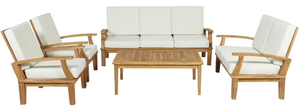 The finish is a polished brown wood with natural marbling. This set includes 1 rectangular coffee table and semi-reclined chairs with armrests: 1 3-seater, 1 2-seater, and 2 1-seater. All were built using tapered blocks of wood. White cushions were added to the seats for the comfort of the users.