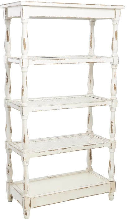 Rectangular shelf organizer carries a distressed white finish over brown wood that adds an antique appeal to the overall look, This fir shelving unit features five spacious shelves with metal and wood surfaces, complete with raised border frames for a non-slip grip display.