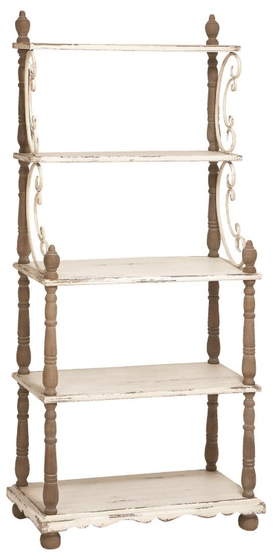 Rectangular shelf organizer displays a distressed white finish, accented with brown spindle sides and ball feet for added charm, This fir shelving unit boasts five spacious shelves supported by turned slender posts, offering both elegance and ample storage.