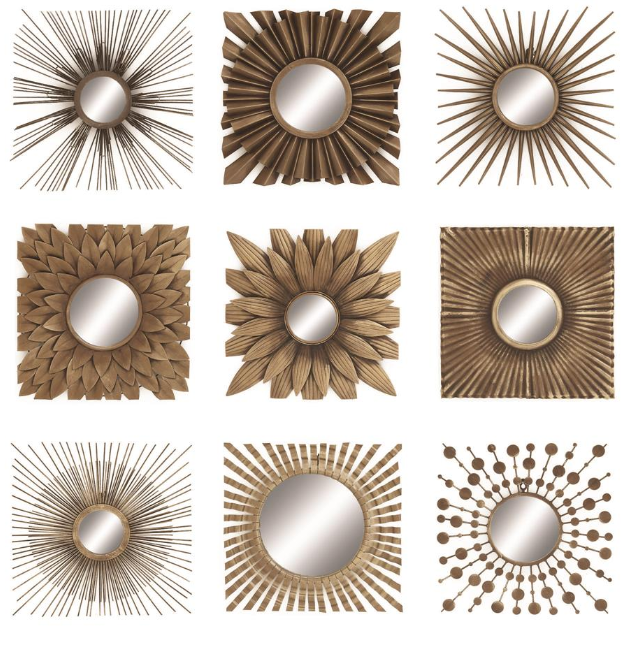 The gold room wall mirror set is crafted of solid iron, MDF, and glass materials. Matte dark gold hue of the square frames highlights this square hanging wall mirrors set. This iron set of 9 wall mirrors features a unique design with square silhouettes and round interior reflective glass mirrors.