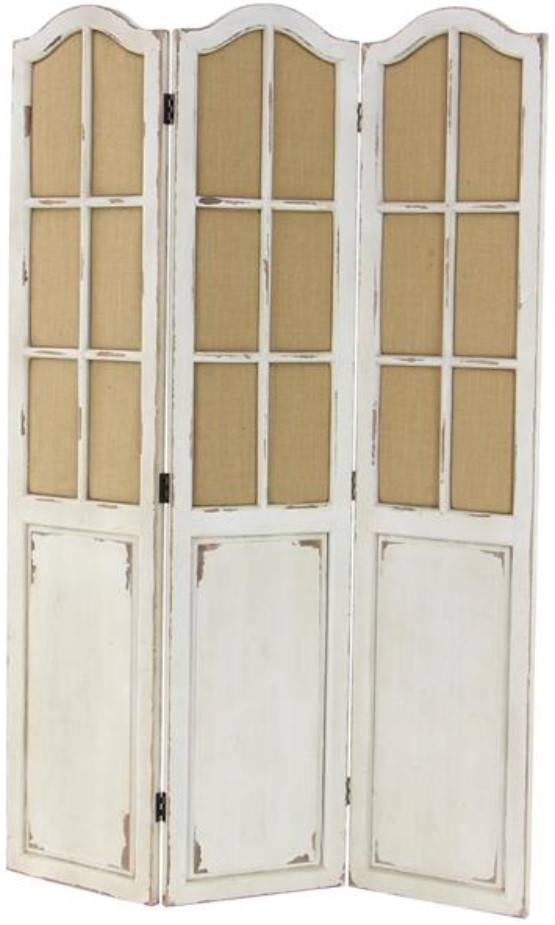 Rectangle room divider and folding privacy screen is beautifully crafted in a beige wood, finished with an antique white paint that enhances its distressed finish. Wood room divider screen features a three-panel design equipped with metal hinges for easy configuration.