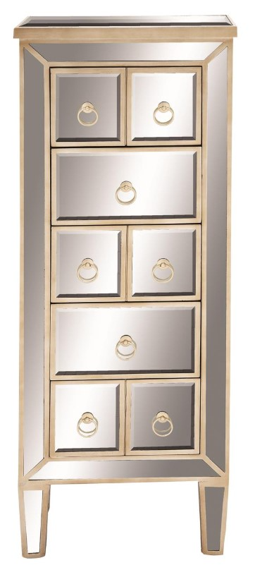Glamorous and elegant, this decor adds some glam to your home. A tall side chest made of MDF and fir wood frame with glass mirror inlay exterior. Metallic beige frame with reflective and gold accent finish highlights this glam chest drawer. The metallic frame finish is complemented with a mirror inlaid top and drawers sporting gold ring handles
